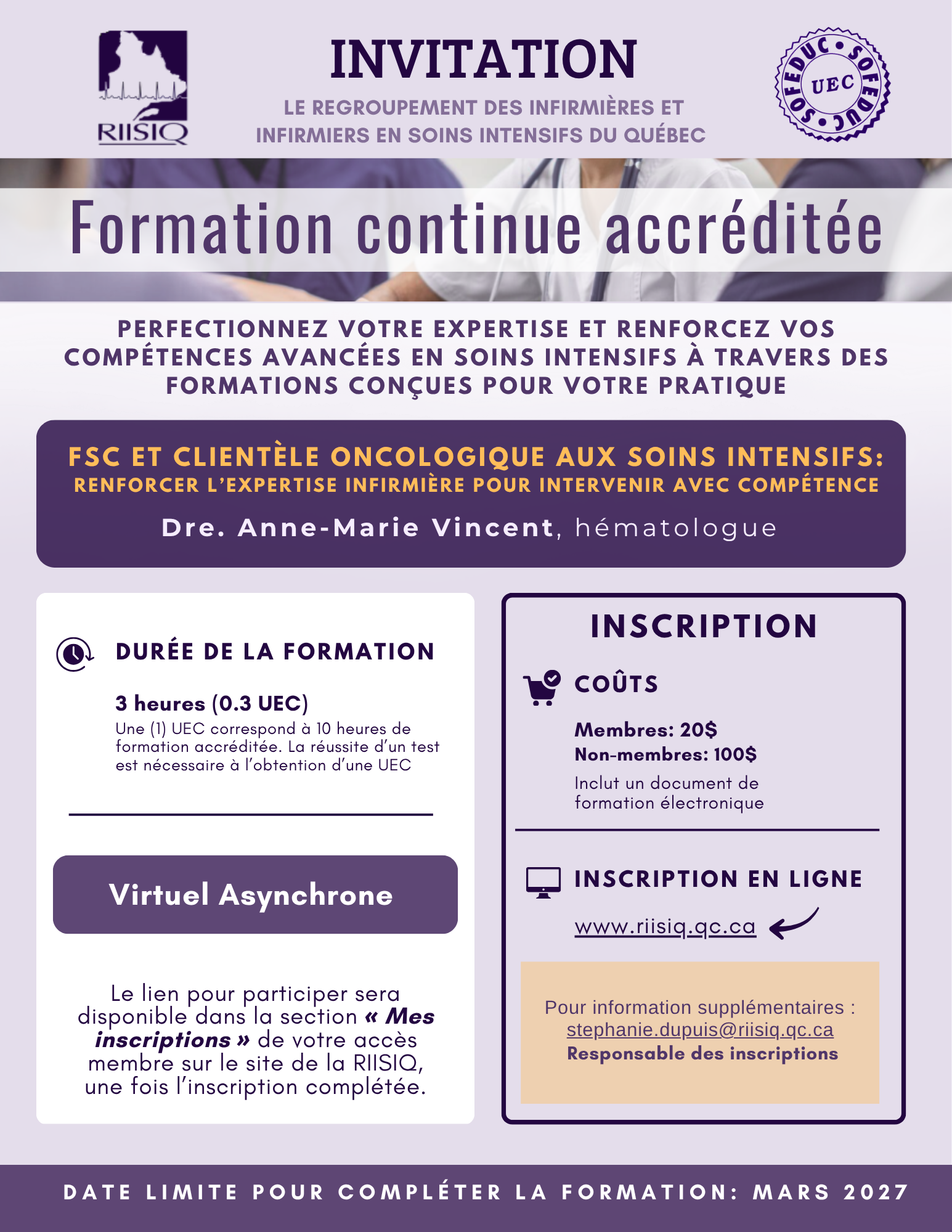 FSC et clientèle oncologique aux soins intensifs- asynchroneFSC et clientèle oncologique aux soins intensifs: renforcer l'expertise infirmière pour intervenir auvec compétence Formation continue accréditée SOFEDUC 0.3 UEC
